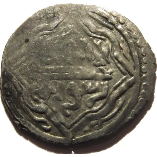 | Obverse description | Inside a double lobed square placed in equilibrium on a summit and inscribed in a circle, the kalima; around, a greeting. |