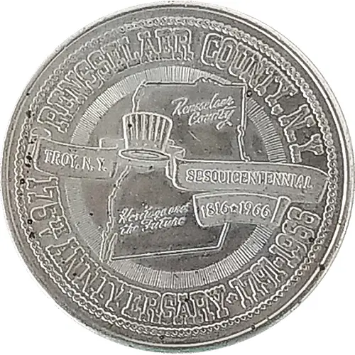 | Obverse lettering | RENSSELAER,N.Y. Rensselaer County TROY, N.Y. SESQUICENTENNIAL 1816☆1966 Heritage and the Future 175TH ANNIVERSARY-1791-1966 |