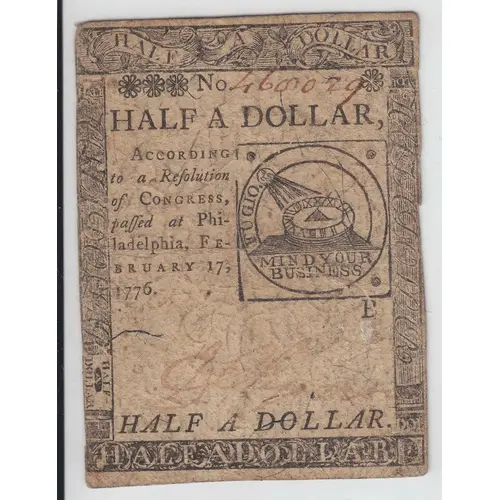 HALF A DOLLAR According to a Resolution of CONGRESS, passed at Phi- ladelphia, Fe- bruary 17, 1776. FUGIO. MIND YOUR BUSINESS HALF A DOLLAR |