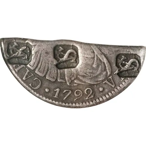 | Reverse description | 1/3 Cut Spanish or Spanish Colonial 8 Reales, with the Castille & Leon coat of arms. |