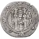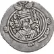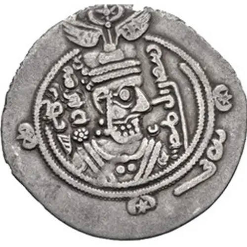 Crowned Sasanian-style bust right; “May xvarrah increase” in Pahlavi behind, “Dād-būrzmihr” in Pahlavi before; open double circle border with star-in-crescent motif at 3, 6, and 9 o’clock and “excellent” in 2nd quarter of margin |