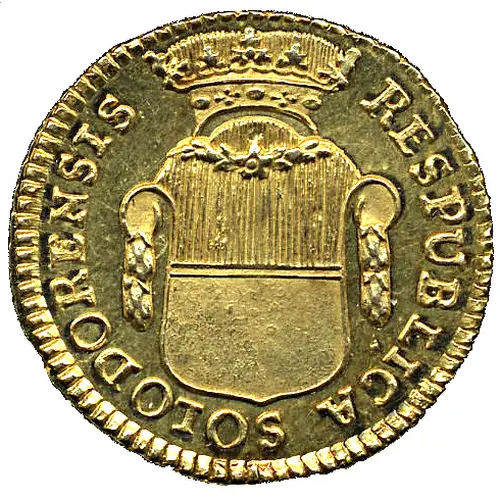 Artistry: The design of the Solothurn 1/2 Duplone adheres to conservative numismatic traditions of Swiss cantonal coinage from the late 18th century. While an engraver is often unrecorded, the style reflects late Baroque influence transitioning towards early Neoclassicism. The obverse commonly features the Solothurn coat of arms, a red and white shield, symbolizing city sovereignty. The reverse usually displays the denomination, date, and sometimes an allegorical figure or inscription, executed with clear, conventional detailing.