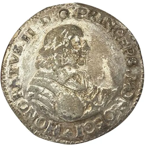 Technical/Grading: Struck in silver (13.2g, 35mm), this large denomination presented challenges for a full strike. Key high-points susceptible to wear on the obverse include the hair, laurel wreath, nose, and drapery folds. On the reverse, the crown’s details and the raised points of the Grimaldi lozenges are critical areas. Collectors should anticipate varying strike quality, with common instances of weak striking, particularly at the flan's edges, and potential planchet irregularities typical of 17th-century coinage production.