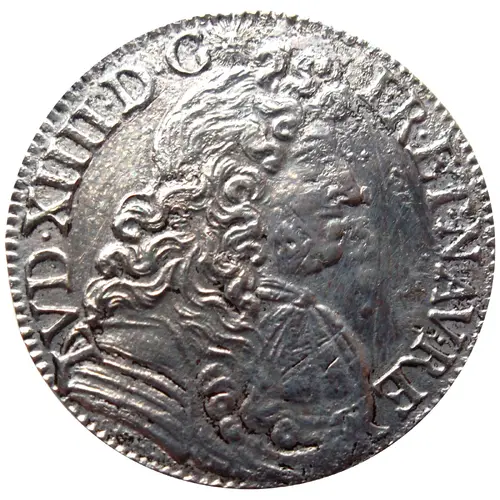 | Obverse description | Bust of Louis XIV on the right, draped and cuirassed with the Cordon de l`Ordre du Saint-Esprit and an embroidered cravat, wearing a wig; the armor not studded. Legend starting at 19 h. |