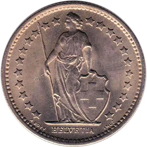 | Obverse description | Full-length figure of Helvetia, standing, facing left, wearing toga, holding a spear in right hand, and supporting shield with coat of arms of Switzerland with left hand. 22 stars around, representing the 22 cantons of the Swiss confederation. In 1983, a 23rd star was added for the Canton of Jura, which was founded in 1979. |