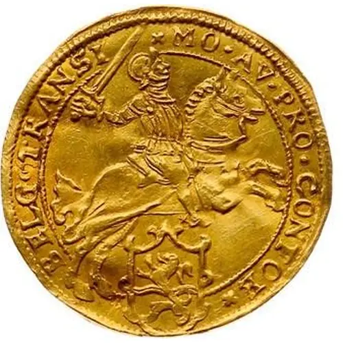 Obverse description Armored knight brandishing sword with right hand, on charging horse to right above crowned arms of Overijssel.