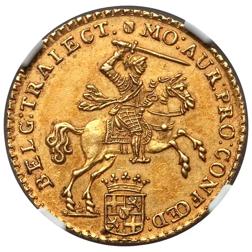MO : AUR : PRO : CONFŒD : BELG : TRAIECT . ⬕ (Translation: Gold coin of the province of Utrecht of the United Provinces of the Netherlands) |