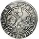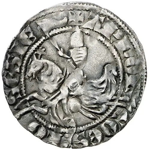 | Obverse description | Mounted knight galloping left, holding banner. Horse`s legs and banner intersect legend |