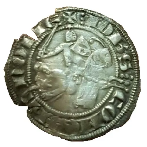 | Obverse description | Knight riding right, holding shield and upright sword; horse`s legs dividing legend |
