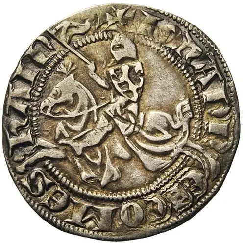 | Obverse description | Knight on horseback riding LEFT, holding a lion shield and banner; horse`s legs dividing legend |
