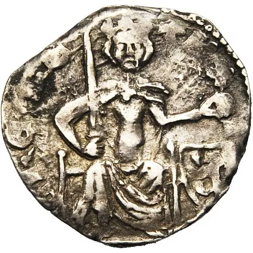 | توضیحات روی سکه | The king sitting on a throne, holding a sceptre in right hand and a globus cruciger in his left. The inscription surrounds it, with a beaded ring on the rim. |