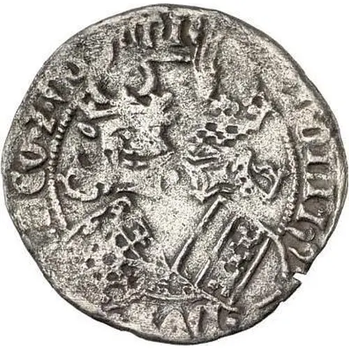 Obverse description Helmets facing each other with the arms of Kleve and of Mark below.