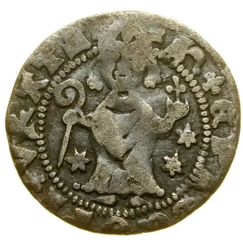 | Obverse description | Full-length forward facing bishop, mitred, holding crozier in right hand, orb in left, flanked by stars in field on each side. |