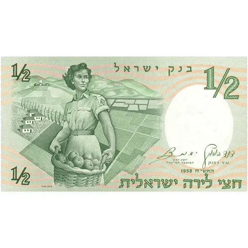Pioneer-woman soldier holding a basket of oranges against a background of fields; the denomination `1/2 Israeli Pound` and `Bank of Israel` in Hebrew. |