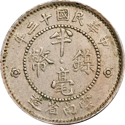 年二十國民華中 半 幣鎳 毫 造省南雲 (Translation: Year 12 of the Republic of China 1/2 Jiao / Nickel coin Made in Yunnan Province) |