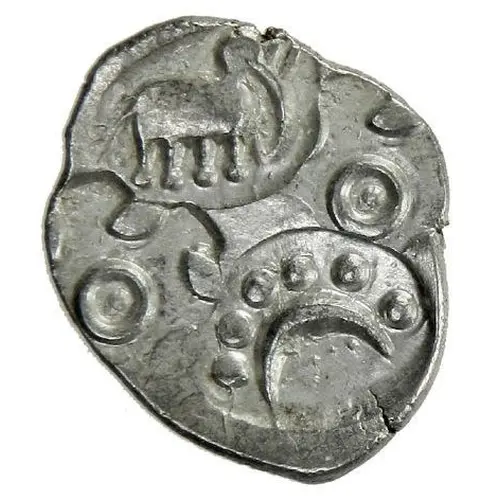 Obverse description 4 punches: elephant left, 3 tauri around 3-part floral pattern (twice) and 9 pellets plus 3 annulets around three leaves (type D)