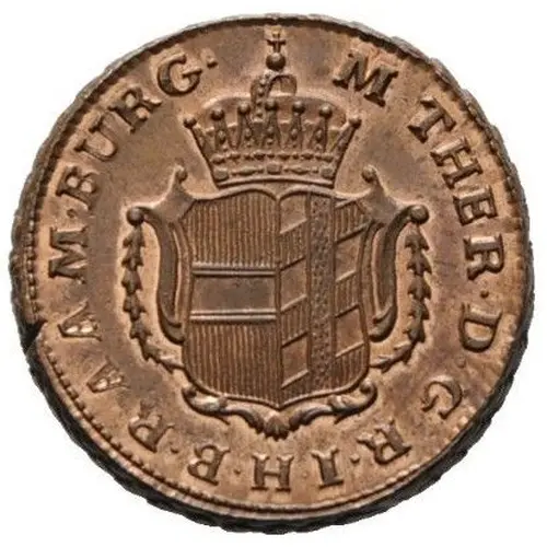 Aversbeschreibung Crowned arms, legend (start 1h) for `Maria Theresia Dei Gratia Romanorum Imperatrix Hungariae Bohemiae Regina Archiducisa Austriae Margravius Burgoviae`