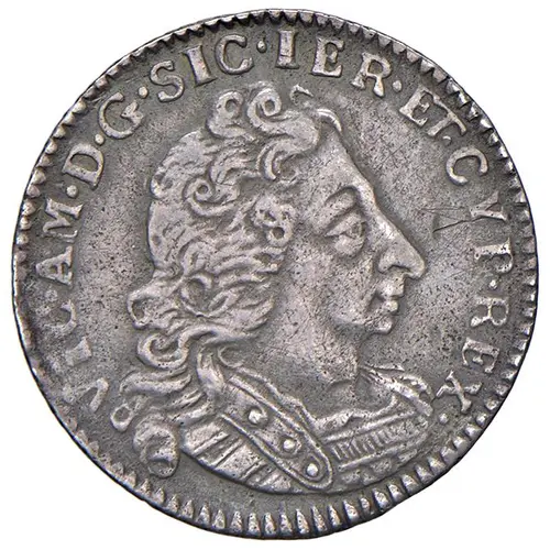 VIC AM D G SIC IER ET CYP REX (Translation: Victor Amadeus by the grace of God King of Sicily, Jerusalem and Cyprus) |