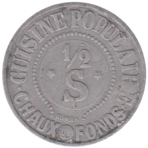 | Obverse lettering | • CUISINE POPULAIRE • CHAUX DE FONDS ★ 1/2 ★ S KLINGER |