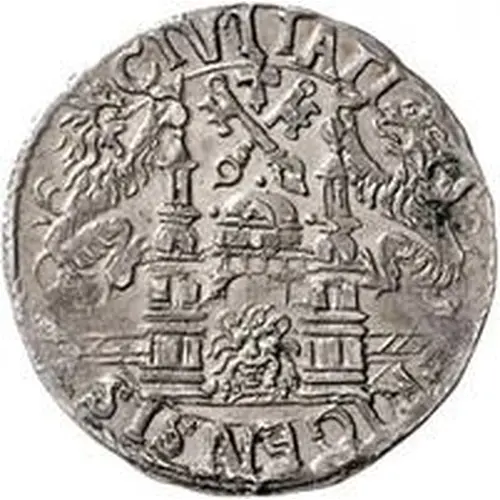 | Reverse description | Crossed keys under cross in ornament shield, all surrounded by legend. |