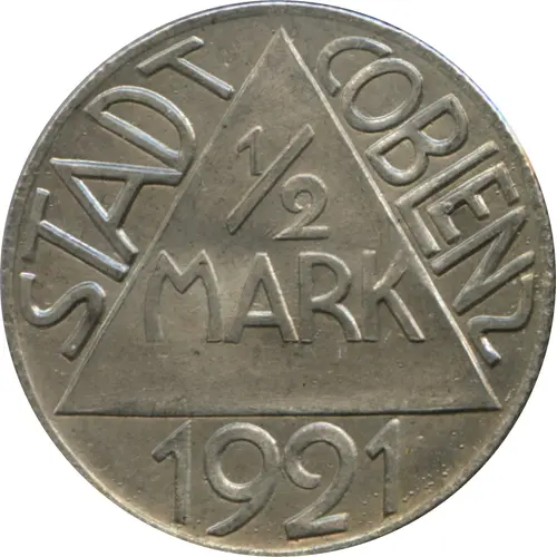 | Obverse lettering | STADT COBLENZ 1921 1/2 mark |
