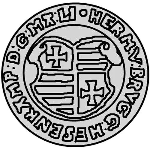 HERM : V : BVRGE : HASENKAMP : D : G : MA : LI · (Translation: Hermann De Bruggeneye Hasenkamp Dei Gratia Magistri Livoniae Hermann von Brüggeneye-Hasenkamp, with God`s grace, Master of Livonia) |
