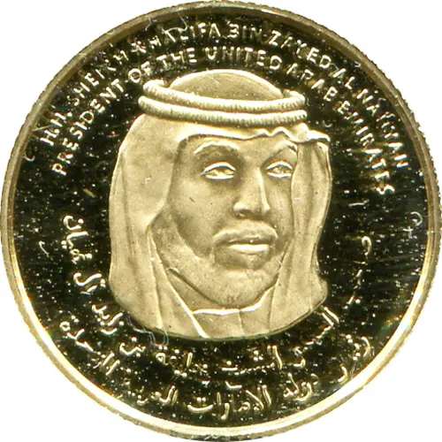 Head of Sheikh Khalifa bin Zayed Al Nahyan facing right, with Arabic and English legends giving his name and title |