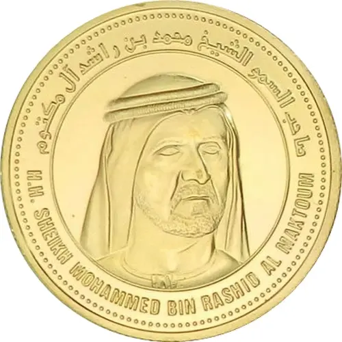 Head of Sheikh Mohammed bin Rashid Al Maktoum facing right encircled, and his name in Arabic above, and in English below |