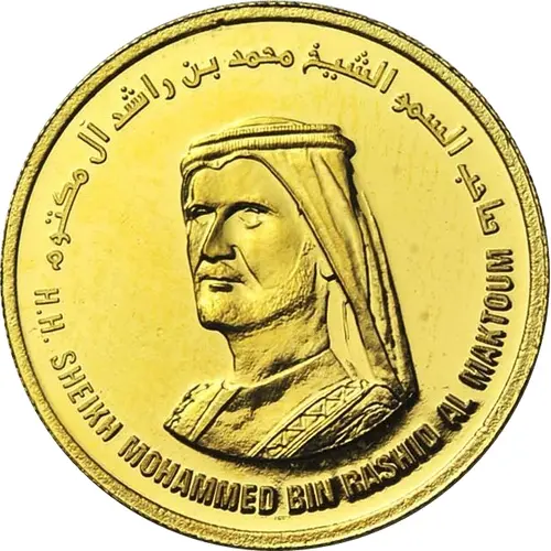 Head of Sheikh Mohammed bin Rashid Al Maktoum facing left, and his name in Arabic above, and in English below |