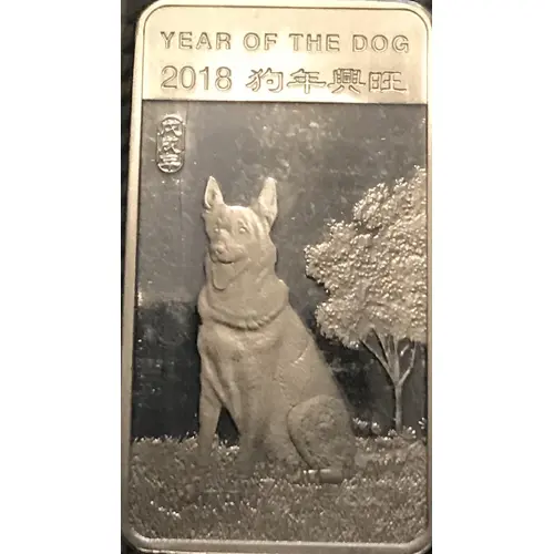 Positive attributes of Year of the Dog written in both Chinese and English as well as details of weight and purity of coin. |