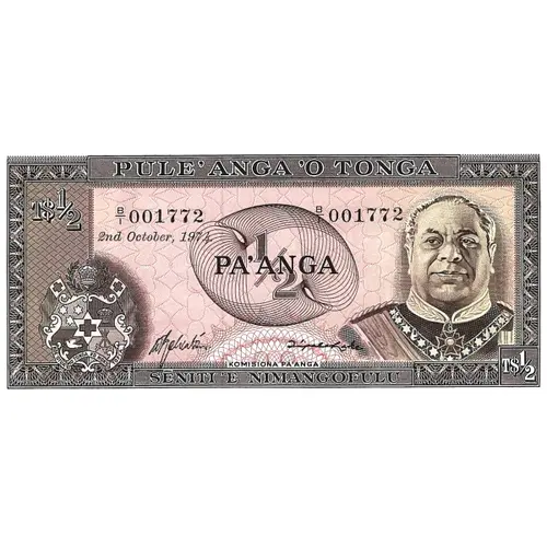 PULE` ANGA `O TONGA T$ 1/2 29th July, 1983 KOMISIONA PA`ANGA PA` ANGA `E NIMANGOFULU (Translation: Government of Tonga July 29th., 1983 Commissioners of amount Half Pa`anga) |