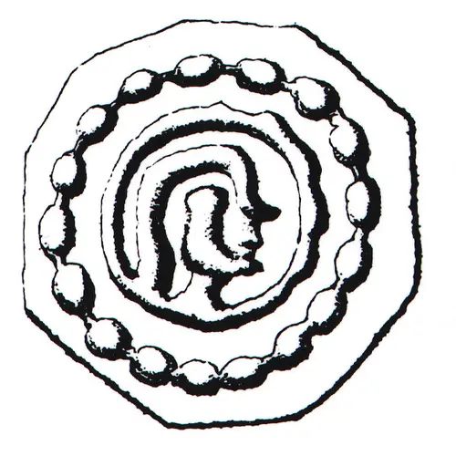 | Descrição do anverso | Simple drawn bust facing right in an inner solid ring and an outer beaded ring. |