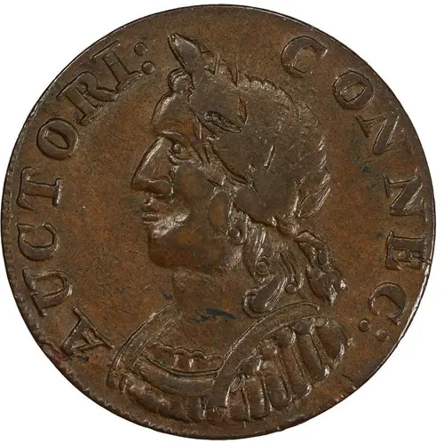 Artistry: The engraver for the 'Hercules Head' series remains unconfirmed, though artisans like Abel Buell are associated with Connecticut's early coppers. Stylistically, these pieces reflect an early American provincial interpretation of contemporary European numismatic design, particularly British halfpennies. The obverse features a classical 'Hercules Head' bust facing right, often crudely rendered, accompanied by "AUCTORI. CONNEC." The reverse depicts a seated Liberty, holding an olive branch and staff, encircled by "INDE. ET LIB." and the date.