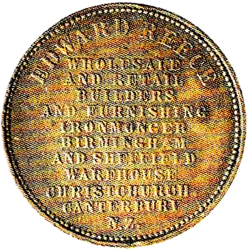 | نوشتههای روی سکه | EDWARD REECE WHOLESALE AND RETAIL BUILDERS AND FURNISHING IRONMONGER BIRMINGHAM AND SHEFFIELD WAREHOUSE CHRISTCHURCH CANTERBURY N.Z. |