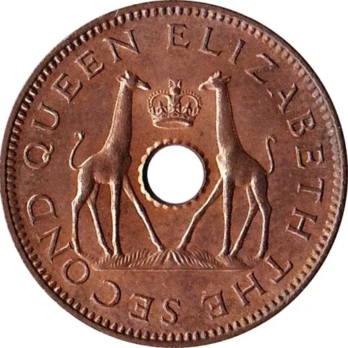 | Obverse description | Two giraffes facing each other around hole, crown above, writing all round |