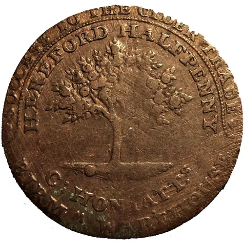 | Obverse lettering | ✿ SUCCESS TO THE CIDER TRADE ✿ HEREFORD HALFPENNY C: HONIATTs. BIRMm WAREHOUSE |