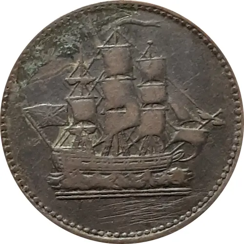 | Obverse description | A frigate sailing right and flying a straight, rectangular pennant from the mainmast, with no square hollow next to the mast. There are no balls where the guys join the mainmast and balls of the other masts are small. A short spike projects from the stern and the afterbrace of the mizzenmast joins the flagstaff. The ensign droops slightly. Similar to BL-2A5 |