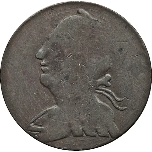 | Reverse description | Crude Britannia seated right with spear and spray of leaves |