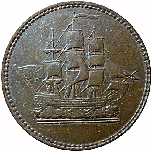 Technical/Grading: Struck in copper, this token measures 26.4mm and weighs 6.4g. Key high-points for grading include the intricate rigging and sails of the ship, where strike weakness or early wear is common. On the obverse, Wellington's hair, uniform, and facial features are critical. Due to contemporary manufacturing, variable strike quality and softer details are typical, with planchet imperfections like laminations or porosity often present.