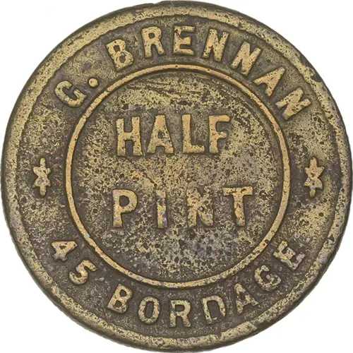 | Obverse lettering | G. BRENNAN HALF PINT 45 BORDAGE |