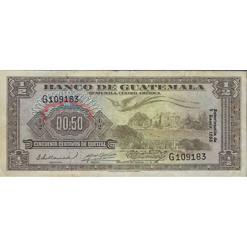 | Obverse lettering | 1/2 Banco de Guatemala 1/2 Guatemala Centro America Cincuenta Centavos De Quetzal Autorización de 5 Enero 1955 1/2 Ermita Del Cerrito del Carmen 1/2 Presidente Gerente Presidente Del Triunal Y.C. De CTAS (Translation: 1/2 Bank of Guatemala 1/2 50 Centavos of a Quetzal Guatemala central America Authorization 5 January 1955 1/2 Hermitage of Cerrito del Carmen 1/2 President Manager Chief Justice Y.C. From CTAS) |