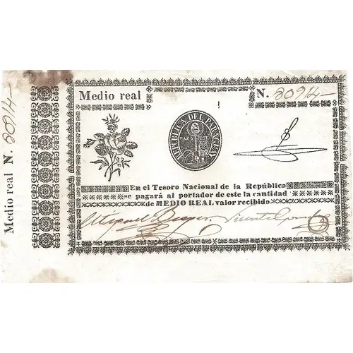 Obverse lettering Medio real Nº REPUBLICA DEL PARAGUAY En el Tesoro Nacional de la Republica se pagará al portador de este la cantidad de MEDIO REAL valor recebido.