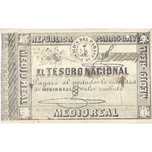 REPÚBLICA DEL PARAGUAY Nº MEDIO REAL EL TESORO NACIONAL Pagará al portador la cantidad de MEDIO REAL valor recibido MEDIO REAL (Translation: Republic of Paraguay Half Real The National Treasury will pay the bearer Half Real paid amount. Half Real) |