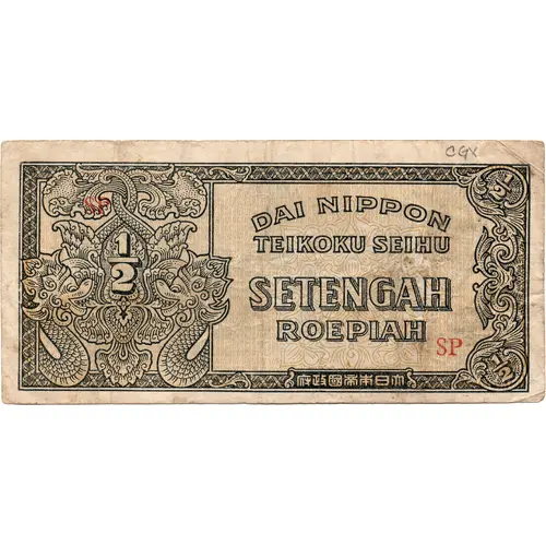 DAI NIPPON TEIKOKU SEIHU SETENGAH ROEPIAH SP 府政國帝本日大 1/2 (Translation: Imperial Government of Japan Half roepiah Imperial Government of Japan) |