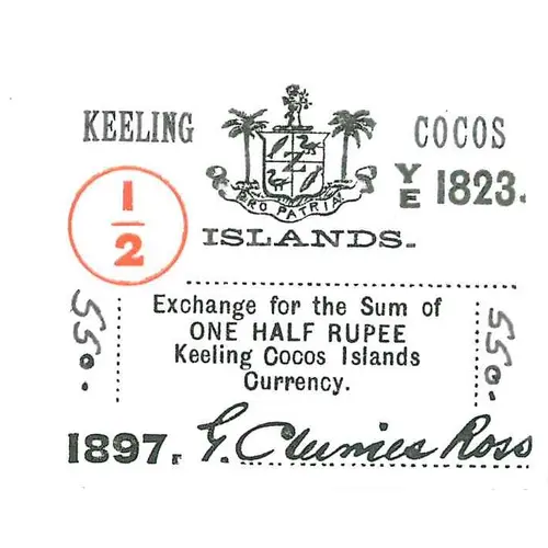 | نوشتههای روی اسکناس | KEELING COCOS Y E 1823 ISLANDS 1/2 Exchange for the Sum of ONE HALF RUPEE Keeling Cocos Islands Currency 1897 |