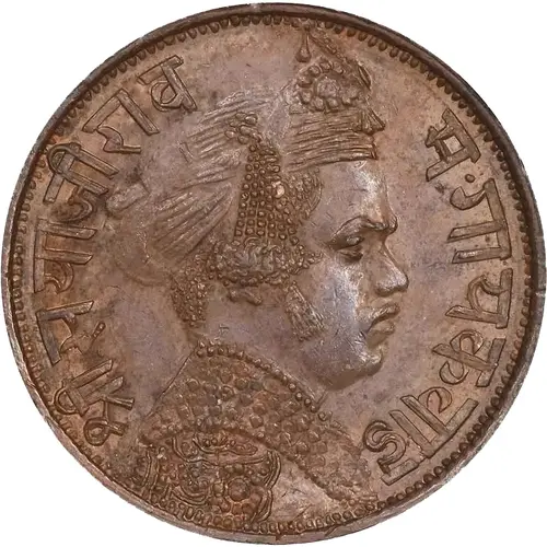 Technical/Grading: As a pattern, this 1/2 Rupee copper piece would typically exhibit a superior strike quality compared to circulating issues. High-points for assessment include the crispness of the Devanagari legends, the intricate details of any central motif, and the sharpness of the rim and denticles. The strike would likely be full, showcasing excellent metal flow into the deepest recesses of the dies. Surviving examples are assessed for their inherent pattern quality, often displaying proof-like surfaces or exceptional detail, with minimal wear given their non-circulating nature, though planchet quality can vary.