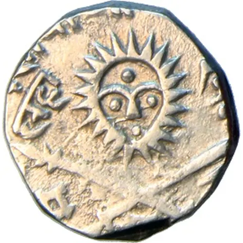 | Descripción del anverso | Sun Face Above crossed Swords, Inscription in Nagari |
