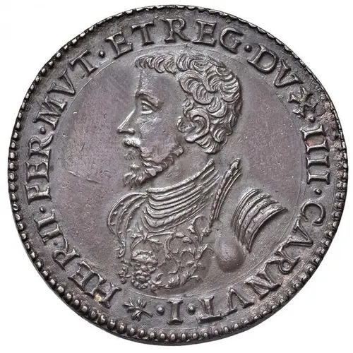 HER·II·FER·MVT·REG·DVX·IIII·CARNVT·I· (Translation: Hercules II fourth Duke of Ferrara, Modena and Reggio) |
