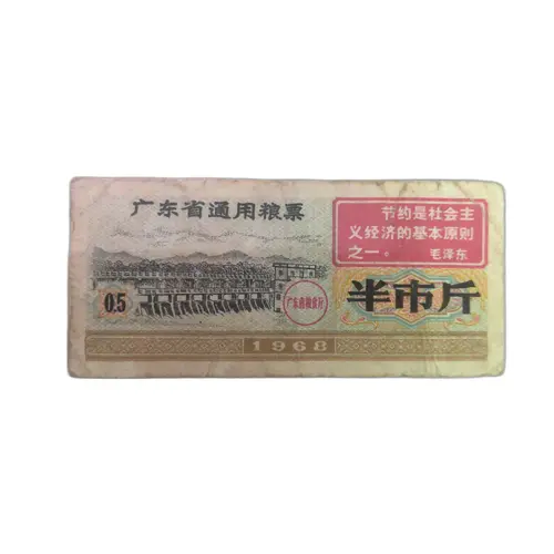 | Obverse lettering | 广东省通用粮票 半市斤 一九六八年 (Translation: Guangdong Province General Food Stamp Half Shi Jin (500g) 1968) |