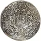 Crowned shield with Gelderland-Zutphen arms over ornate floriate cross that intersects inner beaded circle and legend. A lion in the head of each flower. |